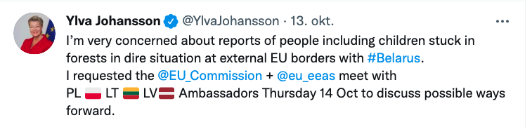 EUs kommisjonær for innenrikssaker, den tidligere svenske politikeren for sosialdemokratene, Ylva Johansson, innkalte nylig Polen, Litauen og Latvia til et møte, der hun uttrykker bekymring for at «folk, inkludert barn (er) fanget i skogen i en kritisk situasjon ved EUs grense mot Hviterussland».