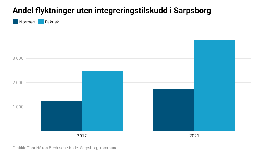 I år er antallet flyktninger uten integreringstilskudd i Sarpsborg omkring 3.750, mens normert, hvis det skulle vært likt over hele landet, skulle Sarpsborg vært på 1.750, skriver SA.