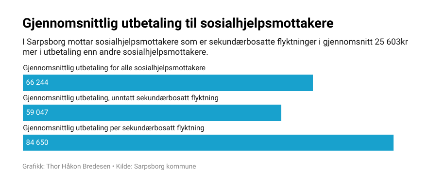 433 sekundærflyktninger i Sarpsborg mottar 84.650 kroner årlig i snitt i sosialhjelp. Gjennomsnittsutbetalingen blant sosialhjelpsmottakere som ikke er sekundærflyktninger, er 59.050 kroner.