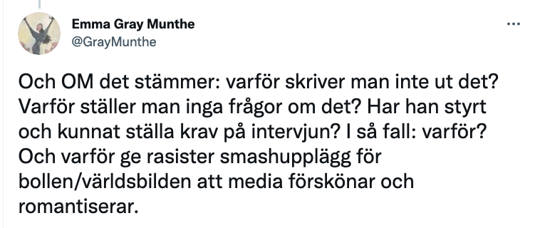 Men Expressens oppslag er nettopp forskjønnende og romantiserende, det kan enhver «rasist» oppfatte – og hva rasister har ned dette å gjøre, får Gray Munthe forklare selv.
