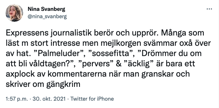 Åpenbart er Svanberg og hennes fan-gruppe på Twitter (det er bare de hun følger eller har omtalt som kan skrive der) i en helt egen boble og forstår ikke hva kritikken handler om. Å granske og skrive faktuelt om gjengkriminalitet er det nok mange i Sverige som venter på, samtidig som det er både perverst og ekkelt å gjøre hyperkriminelle til en salig røre mellom offer og helt.