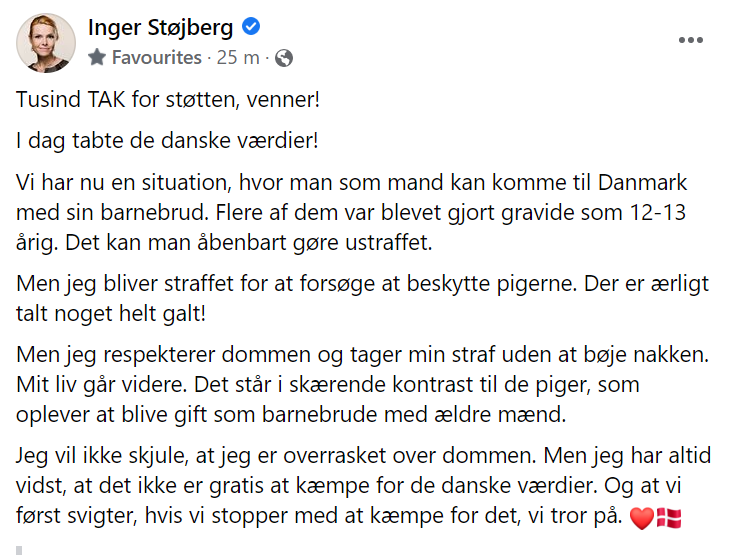 Facebook-statusen til Støjberg som i dag ble felt i Rigsretten i den såkalte barnebrud-saken, tar fullstendig av.