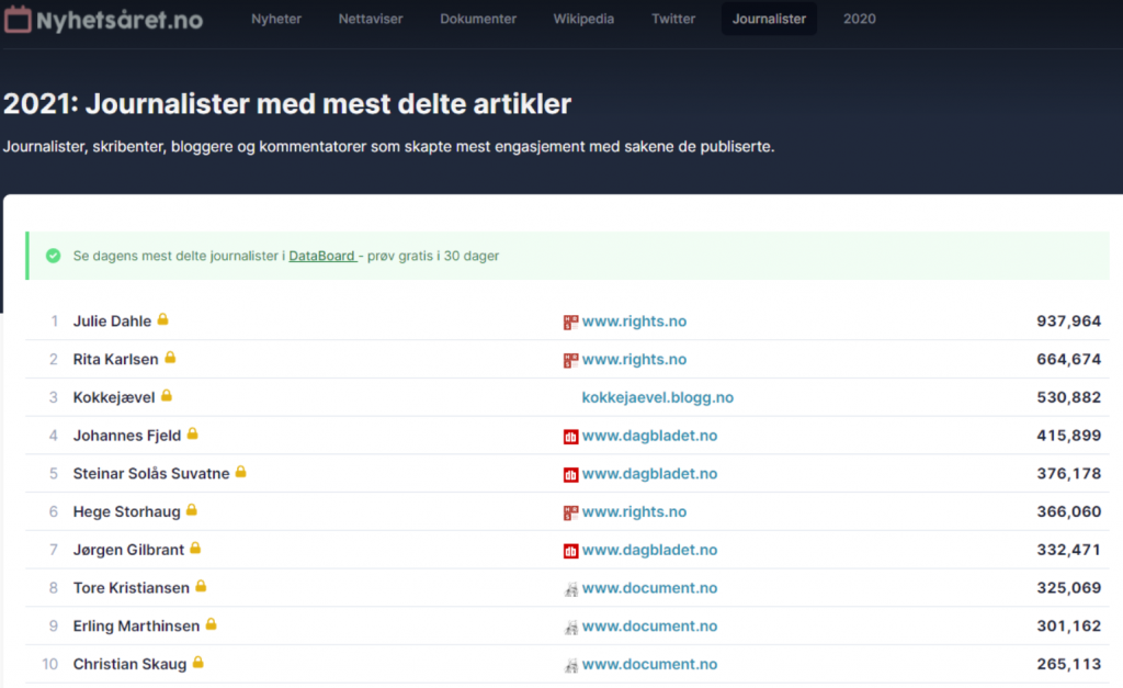Som dere ser, er Dagbladet først på en 4. plass, slått av Julie med over 500.000 reaksjoner, mens Document inntar en solid 8., 9., og 10. plass.