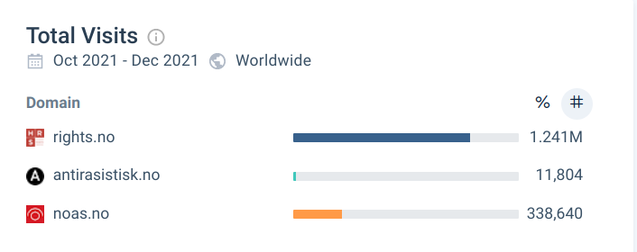 Sammenlikner vi rights.no med andre NGOer på innvandringsfeltet, er det åpenbart at innvandringskritikk har langt bredere engasjement i befolkningen enn hva innvandringspromotering har. Antirasistisk Senter har knappe 12.000 besøk i løpet av en tremåneders periode, noe som tyder på svært lite engasjement, mens den minoritetspolitiske tenketanken Minotenk i likhet med Agenda har så få treff at similarweb ikke får hentet tall til sammenlikning.