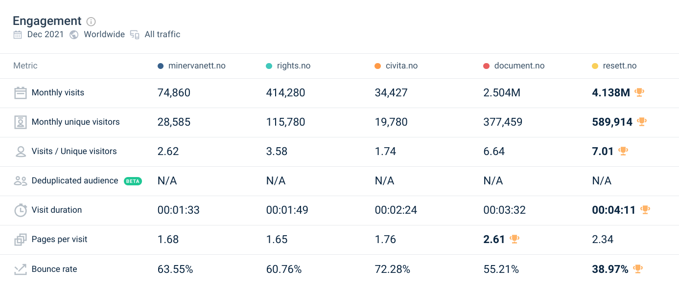 Den «partipolitisk uavhengige tankesmien som bidrar til samfunnsanalyse og politikkutvikling for det moderne sentrum-venstre» – Agenda, har så få treff at similarweb ikke klarer å hente relevante tall for sammenlikning. Treff til de øvrige nettstedene er som følger, her for desember 2021, som er siste tidsperiode det er mulig å hente tall fra: