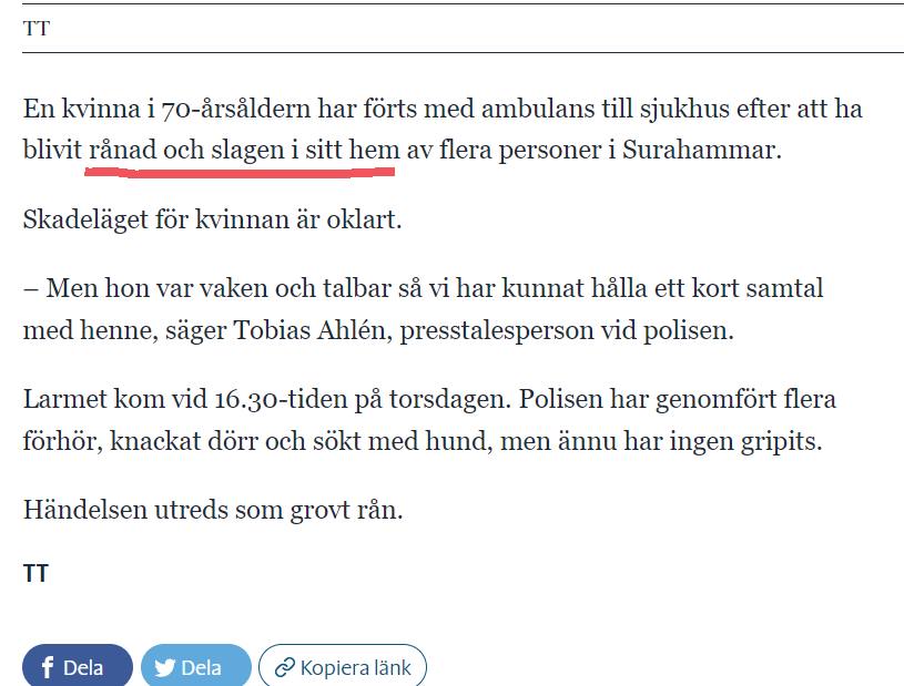 Vi skriver ikke om skuddvekslinger og knivstikkinger i særlig grad lengre, og i alle fall ikke dersom de skjer i Sverige. Ingen øyenbryn heves, ingen interesserer seg nevneverdig, «ingenting å se her… gå videre…». Vi presenterer statistikk og kommenterer samfunnsutviklingen, men enkeltepisoder vet vi av erfaring at folk ikke interesserer seg særlig for. Det er for mange av dem til at folk orker å bry seg. Man kan ikke godt bry seg i hvert eneste tilfelle heller, da ville man hengi seg til en evig sorg.