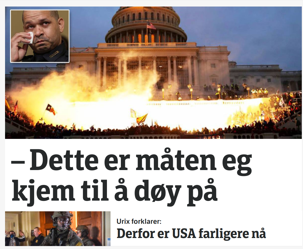 Man kan undre seg over hva de etterlatte etter 9/11 tenker om omtalen av Capitol Hill-bråket som det største angrepet på demokratiet i moderne tid. «Den aller mørkeste dagen«, kaller VG det. Aftenposten skrev onsdag at «6. januar var et varsel om fare. Den er ikke over». NRK framstiller årsdagen for stormingen som om døden straks rammer oss alle. Faksimilen viser hvordan statskanalens forside på nett ser ut i skrivende stund: