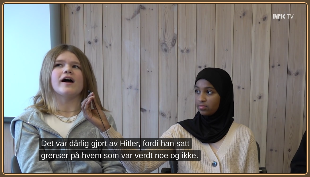 Igjen presenterer statskanalen lettversjonen av Holocaust, en «mindre belastende» versjon som enkelt kan sammenliknes med rasisme, og i neste øyeblikk hverdagsrasisme. Resultatet: en hel generasjon som mangler en sann følelse av ondskapen og omfanget av drapet på jødene. At et prepubertalt jentebarn iført hijab sier at det er fint at det er laget en dag for å tenke på jødene, gjør innslaget nær absurd. Det er med dette relieffet det er mulig å komme med den vanvittige påstanden om at muslimske innvandrere er «de nye jødene».