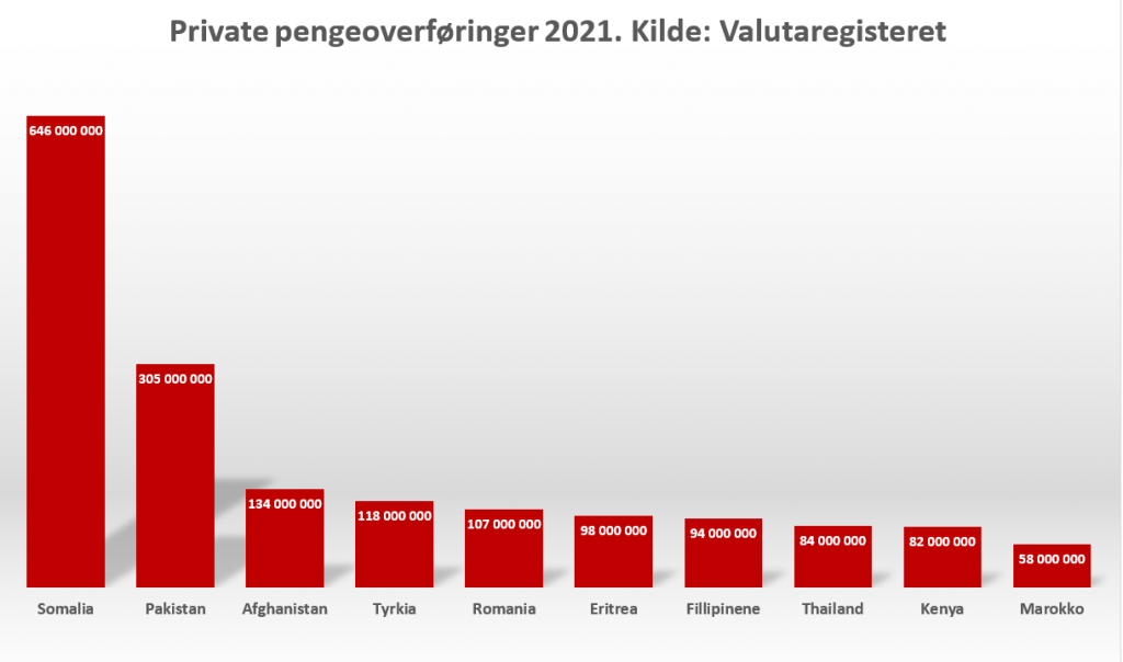 Tar vi også med tallene som foreligger for 2018, 2019, og 2020, har somalierne overført mer enn 2,2 milliarder kroner til privatpersoner i Somalia de siste fire årene. Pakistanere ligger på en god andreplass med 1,35 milliarder kroner. De tre topplandene Somalia, Pakistan og Afghanistan, er alle mislykkede muslimske stater (failed states).