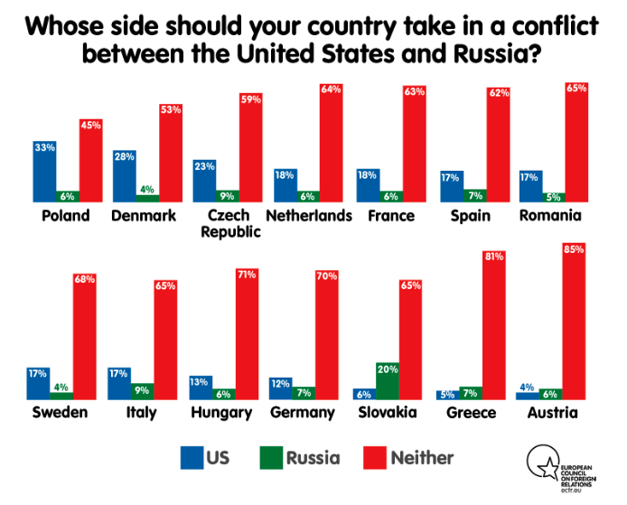 Foldager har tatt frem en større undersøkelse (2019) fra tenketanken European Council on Foreign Relations, hvor det avdekkes at ingen europeisk befolkning vil hjelpe amerikanerne i en konflikt med russerne. I store land som Spania, Nederland, Frankrike og Italia vil mindre enn en femtedel støtte USA i en konflikt mellom de to landene. I Tyskland vil bare 12 prosent støtte amerikanerne. Motsatt vil såpass mange som 7 prosent av tyskerne støtte russerne. Det er nokså utrolige tall.