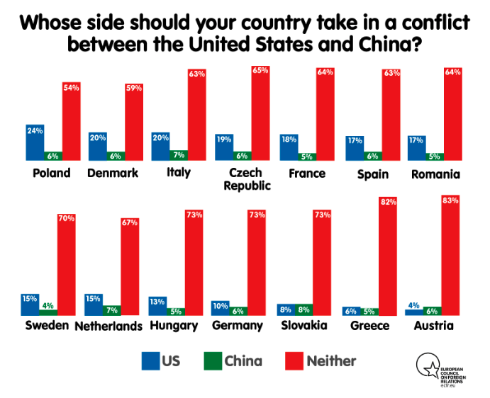 At europeerne ikke vil forsvare USA bekreftes av spørsmålet knyttet til Kina; hvilken side ville vi valgt i en konflikt mellom USA og Kina? Bildet endrer seg ikke, men USA taper enda mer terreng: