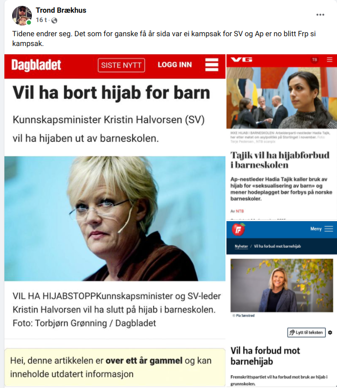 Han skriver at «Tidene endrer seg. Det som for ganske få år sida var ei kampsak for SV og Ap er no blitt Frp si kampsak» og viser en rekke avisklipp som underbygger påstanden.