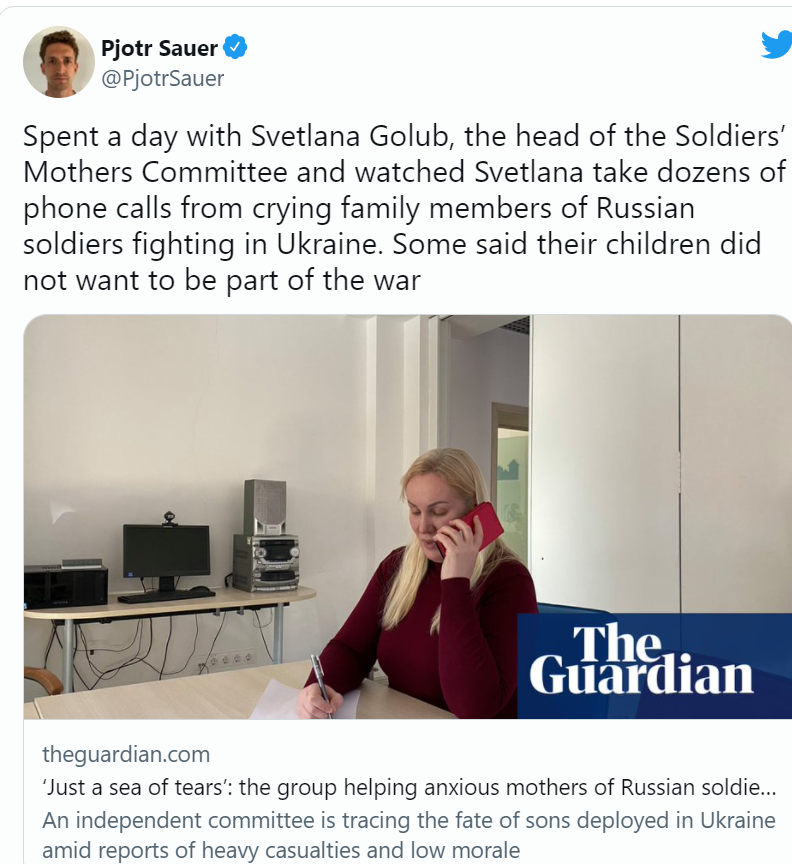 Det samme fremgår av udtalelser fra russiske krigsfanger og deres familier. Den russiske organisasjon Soldatermødrenes Komité drukner i oppringinger fra gråtende mødre, beskriver en journalist, som tilbrakte en hel dag hos komiteen, i Guardian.