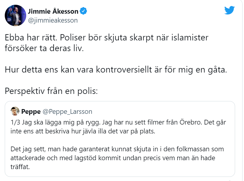 «Ebba har rett. Politiet bør skyte skarpt når islamister prøver å ta livet deres. Hvordan dette kan være kontroversielt er for meg en gåte.» Åkesson viser til en politibetjent som sier politiet garantert kunne ha skutt mot voldselementene og hatt loven på sin side.
