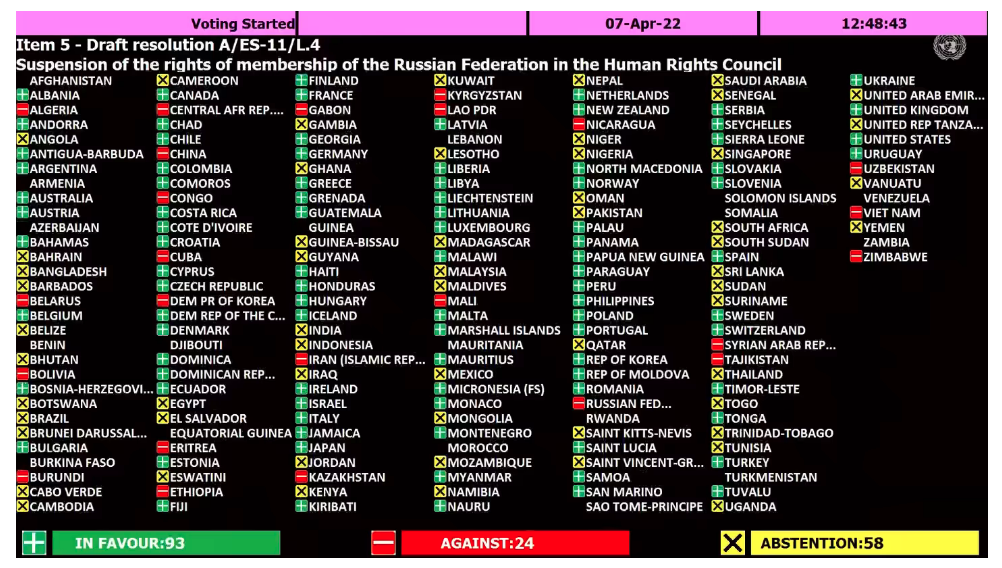 Kort fortalt stemte 93 for og 24 mot resolusjonen som fordømmer Russland i sterke ordelag og samtidig ber om at landet suspenderes fra FNs menneskerettighetsråd. Men det enda mer oppsiktsvekkende er at hele 58 avsto fra å stemme.