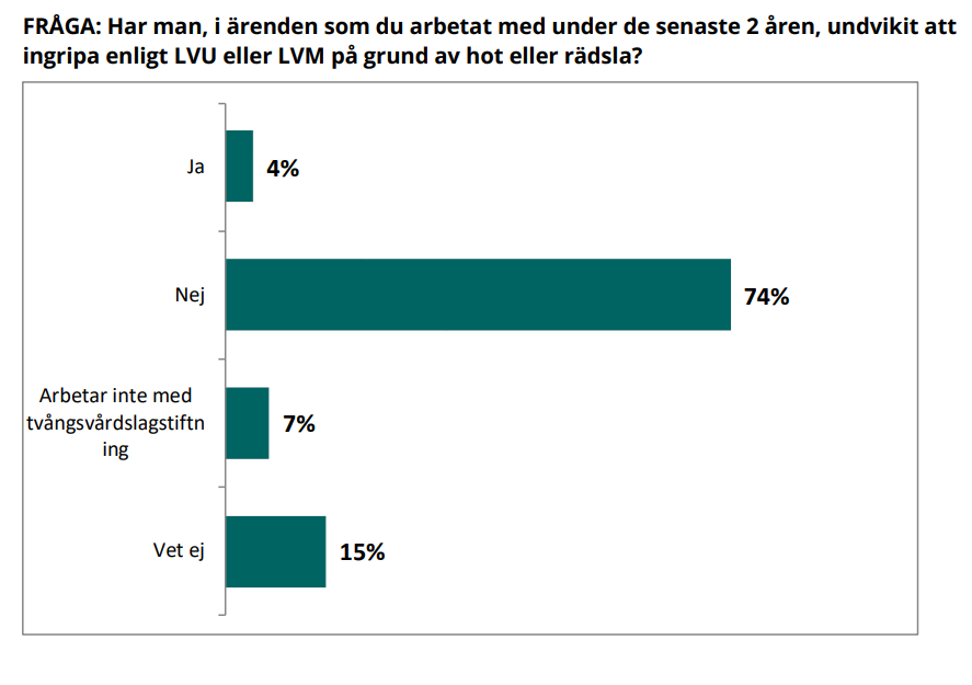 En sosialarbeider på tjuefem svarte at de hadde unngått å gripe inn i henhold til LVU eller LVM på på grunn av trusler eller frykt. Det er mer enn dobbelt så vanlig for sosialarbeidere i utsatte områder at de svarer at de unngikk å gripe inn sammenlignet med sosialarbeidere fra andre områder. I utsatte områder svarer én av fjorten ja på spørsmålet sammenliknet med andre sosialarbeidere, hvor en av trettitre svarer ja, heter det i rapporten.