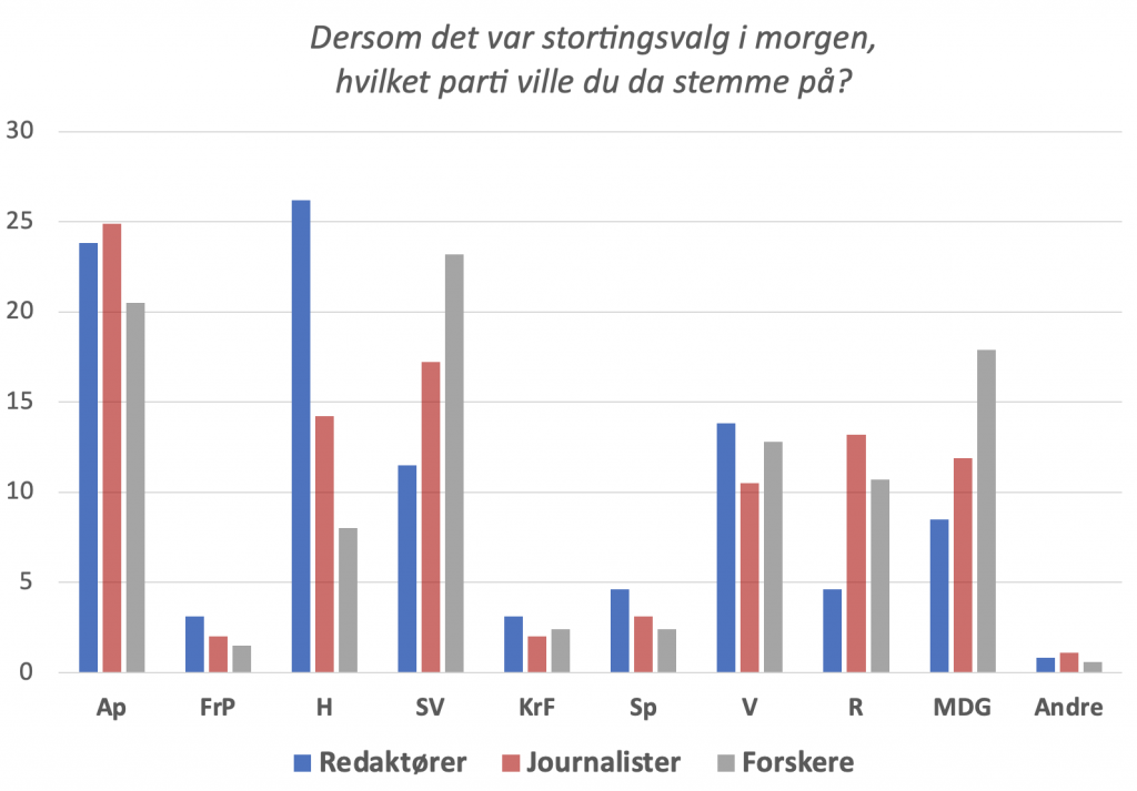 I Medieundersøkelsen svarer norske redaktører, journalister og forskere hvem de ville stemt på dersom det var stortingsvalg i morgen. Bildet ser slik ut: