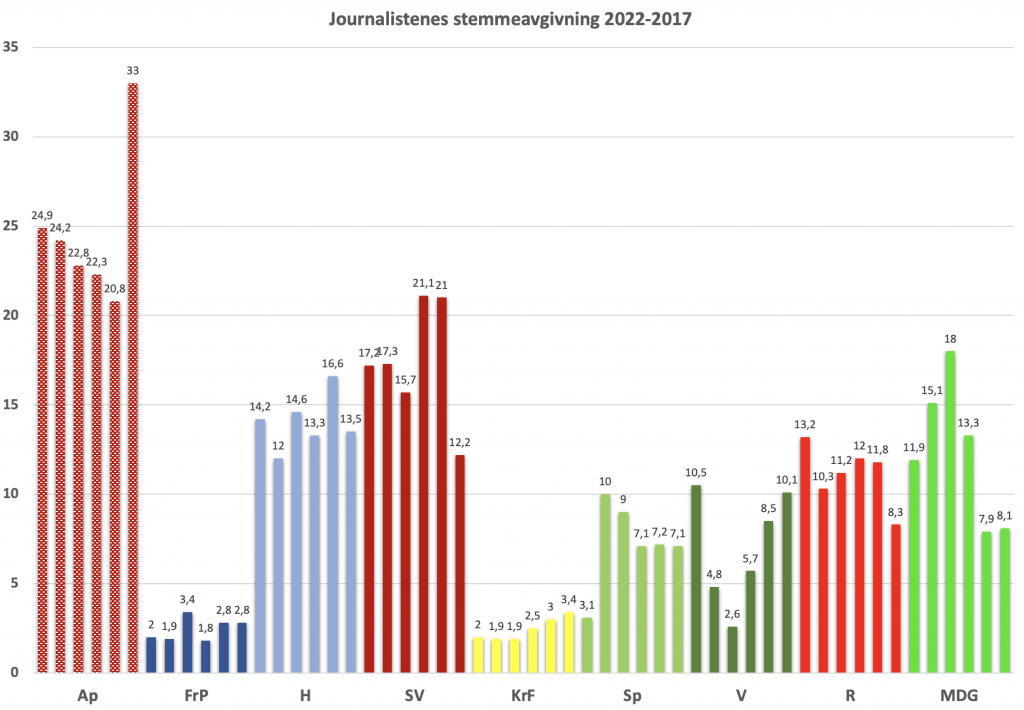 Mens flertallet av redaktørene har Høyre som favoritt (26,2 prosent), fulgt av Ap på andreplass (23,8) og deretter Venstre (13,18), stemmer de fleste av journalistene på Ap (24,9) etterfulgt av SV (17,2) og Høyre (14,2). Men også Rødt og MDG har mange journaliststemmer med henholdsvis 13,2 og 11,9 prosent, igjen tett fulgt av Venstre (10,5).