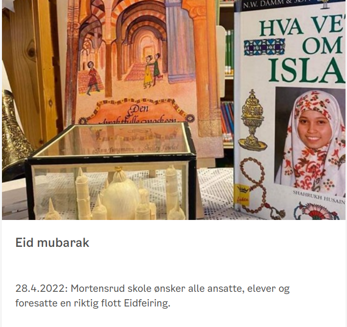 På Mortensrud skole er etniske nordmenn en minoritet, og slik har det vært de siste to tiårene. På skolens nettsider ønskes «ansatte, elever og foresatte en riktig flott Eidfeiring».