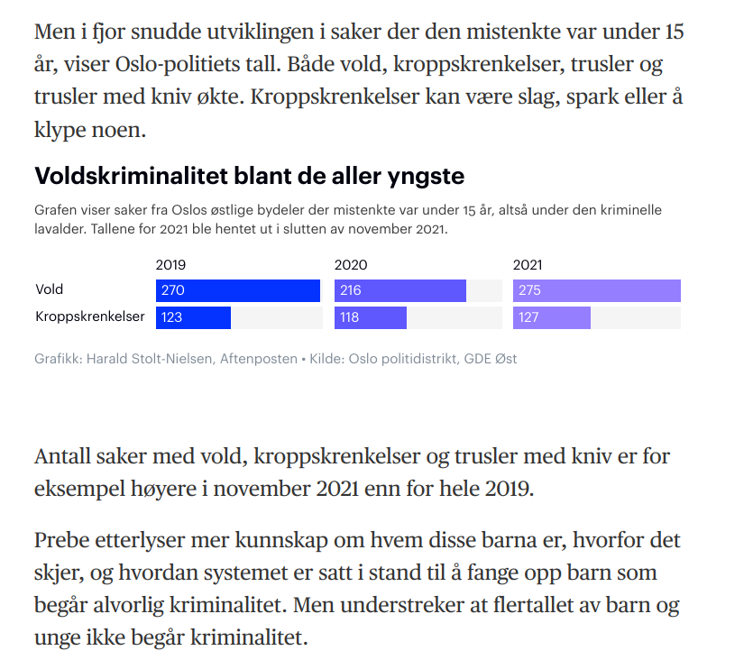 Denne oppsummeringen er ikke helt ærlig fra avisens side. Senest i januar i år hadde Aftenposten selv en artikkel som het Ny rapport: Kriminaliteten øker igjen blant de yngste på Oslos østkant. Innholdet i artikkelen er jo avslørt allerede i overskriften, men for å utdype er dette utdraget av artikkelen betegnende:
