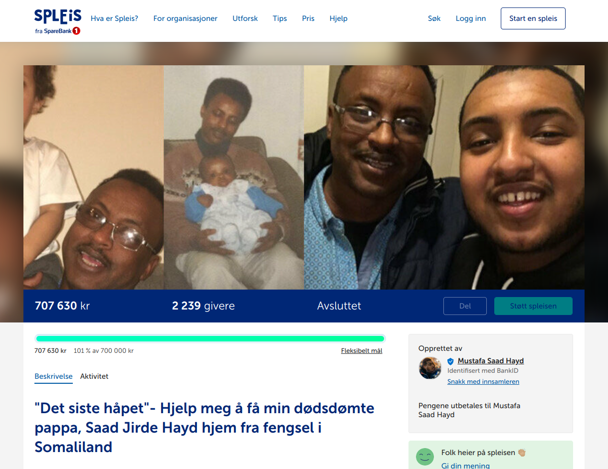 «Alle pengene går direkte og uavkortet til å betale for den erstatningssummen som bidrar til løslatelse av pappa Saad Jirde Hayd fra dødsstraff og fengsel i Somaliland. Alle midlene håndteres av advokat John Christian Elden og advokat Farid Bouras, ved Elden Advokatfirma AS. Jamal Sheik (Rasisme i Norge) hjelper også til», heter det på spleis.no, der innsamlingen av 700.000,- gikk som smurt.