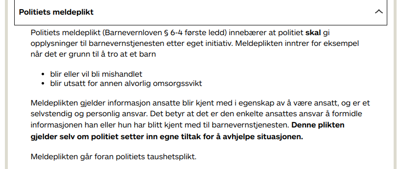 Bufdirs nasjonale retningslinjer for samhandling mellom politi og barnevern er klokkeklar på politiets plikt til å melde ved voldshendelser. Å ta med seg barna sine for å utøve vold mot offentlige tjenestemenn og øvrig materiell vold kan ikke utelates fra voldshendelser av annen art.