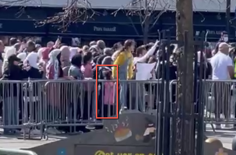 Bildet han har klippet fra videoen er dette, der et lite barn tydelig står helt inntil sperringene som var satt opp i forkant av demonstrasjonen. Barnets høyde gjør det enkelt å anslå at hun er omtrent fem år gammel.