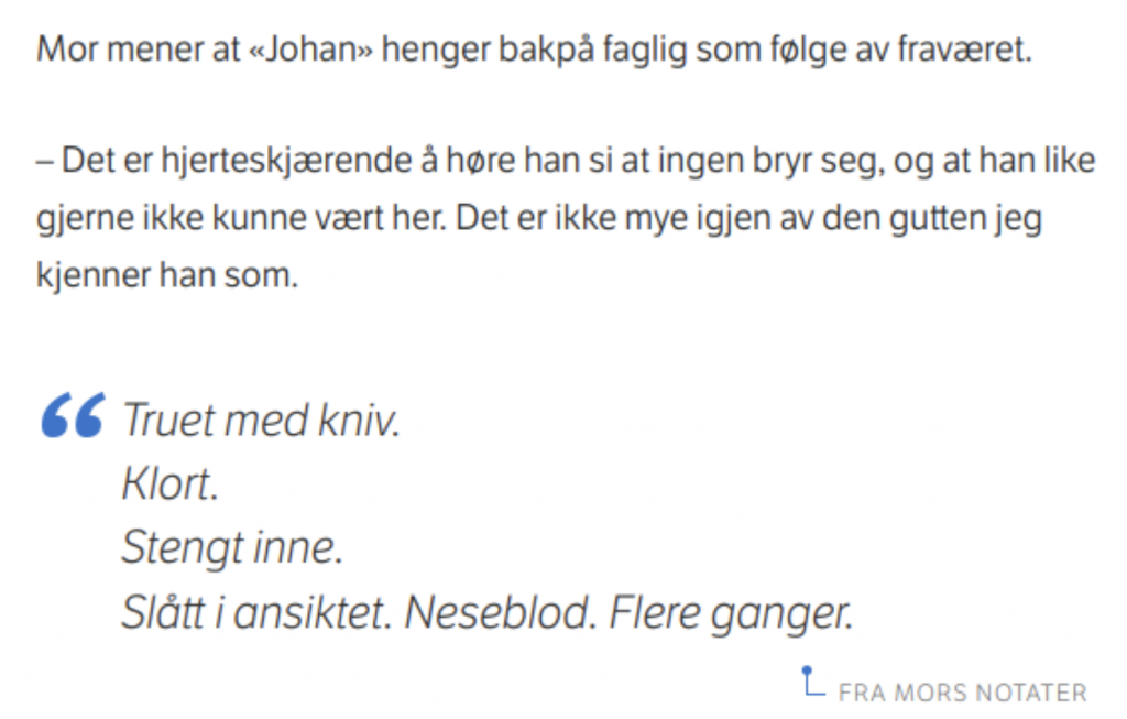 Voldshandlingenes art, som beskrevet i NRKs sak, kan likevel være med på å belyse hvilke barn det er som utøver vold mot andre barn. En mor med et barn som siden oppstart i barneskolen har vært utsatt for vold og trakassering, melder følgende: