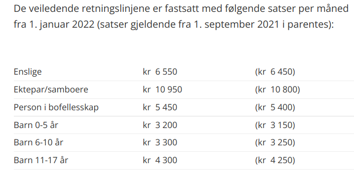 Slik er satsene for livsopphold per i dag, hentet fra regjeringens nettsider, med presisering om hva beløpene er ment å dekke: