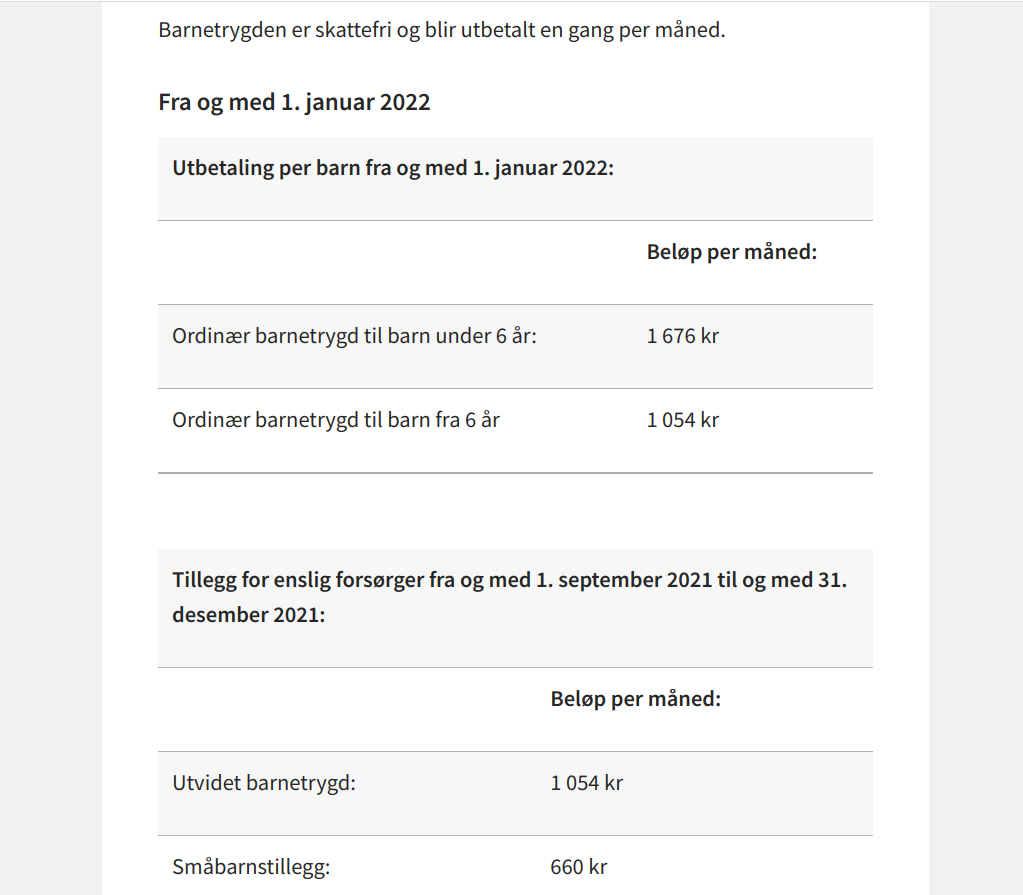 Og så var det barnetrygden, som mange kommuner tidligere har avkortet sosialstønaden med, men nå pålegges å utbetale i tillegg. Også barnetrygden er en skattefri ytelse, og den har nylig fått en oppjustering. På NAVs oversikt ser vi satsene slik de er i dag:
