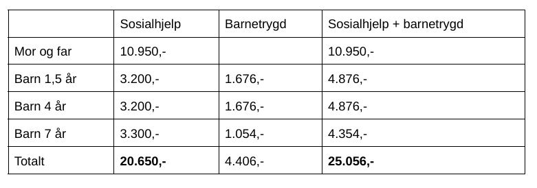 Merk at dekning av bokostnader kommer i tillegg. Ved anslag 15.000,- per måned, får familien månedlig 40.056,-