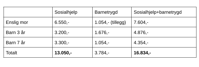 Merk at dekning av bokostnader kommer i tillegg. Ved anslag 10.000,- per måned, får familien månedlig 26.834,-