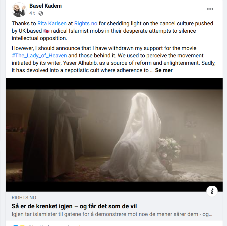 Kjære Rita Karlsen Måtte du og dine ha det godt. Takk for den nylige dekningen av islamistisk kanselleringskultur i Storbritannia ifm. filmen “The Lady of Heaven”. Jeg vil dog å meddele at jeg ikke ønsker fremtidig tilkobling til filmen eller dens produsenter, da jeg har trukket tilbake min støtte. De er også ekstremt radikale islamister som driver kanselleringskultur mot sine egne, slik jeg skrev i FB innlegget. Forøvrig, kan du ha interesse for dette brevet jeg har sendt til BBC. Gjør med den informasjonen hva du mener er riktig.