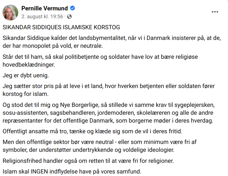Kommentarfeltet under videoen viser med all tydelighet at det er svært mange dansker som lar seg provosere av Siddiques uttalelser, der mange tar til orde for at Danmark må og skal beholde nøytralitetsprinsippet. En kommentator skriver at Siddique bør reise ned til de muslimske vennene sine, og det er Pernille Vemunds svar som har fått temperaturen til å stige til kokepunktet ikke bare i danske sosiale medier, men i mediene generelt. For Vemund lar seg ikke pille på nesen av Siddiques påfølgende påstander om rasisme og uverdig debattstil. Hun står på sitt.
