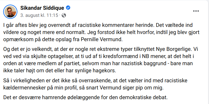 Også på egen Facebook-side er Siddique opprørt, og insinuerer at folk som er tilknyttet Nye Borgerlige både er ekstreme rasister og nazister. Han omtaler dem som sympatiserer med Vermund som «kjellermennesker».