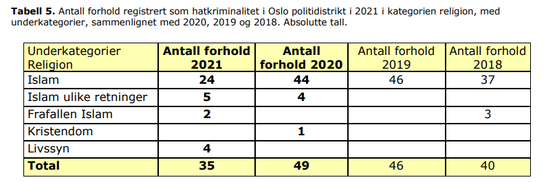 På statistikken over anmeldt religiøst motivert hatkriminalitet er det mange muslimer. Slik ser Oslo-tallene ut for i fjor:
