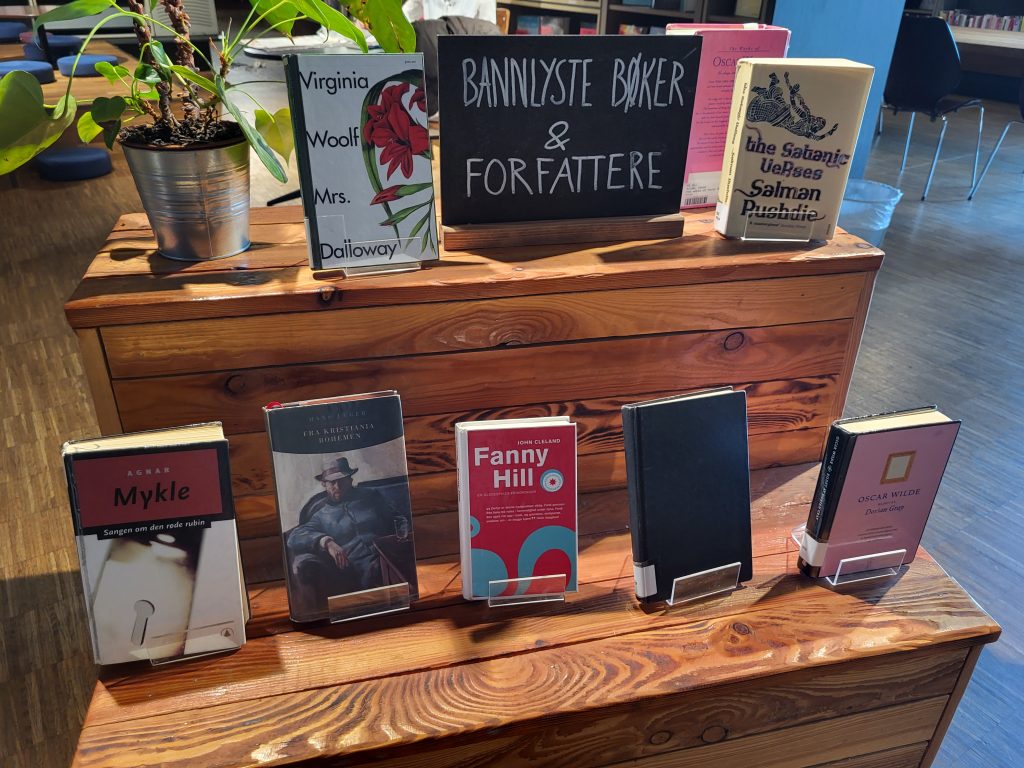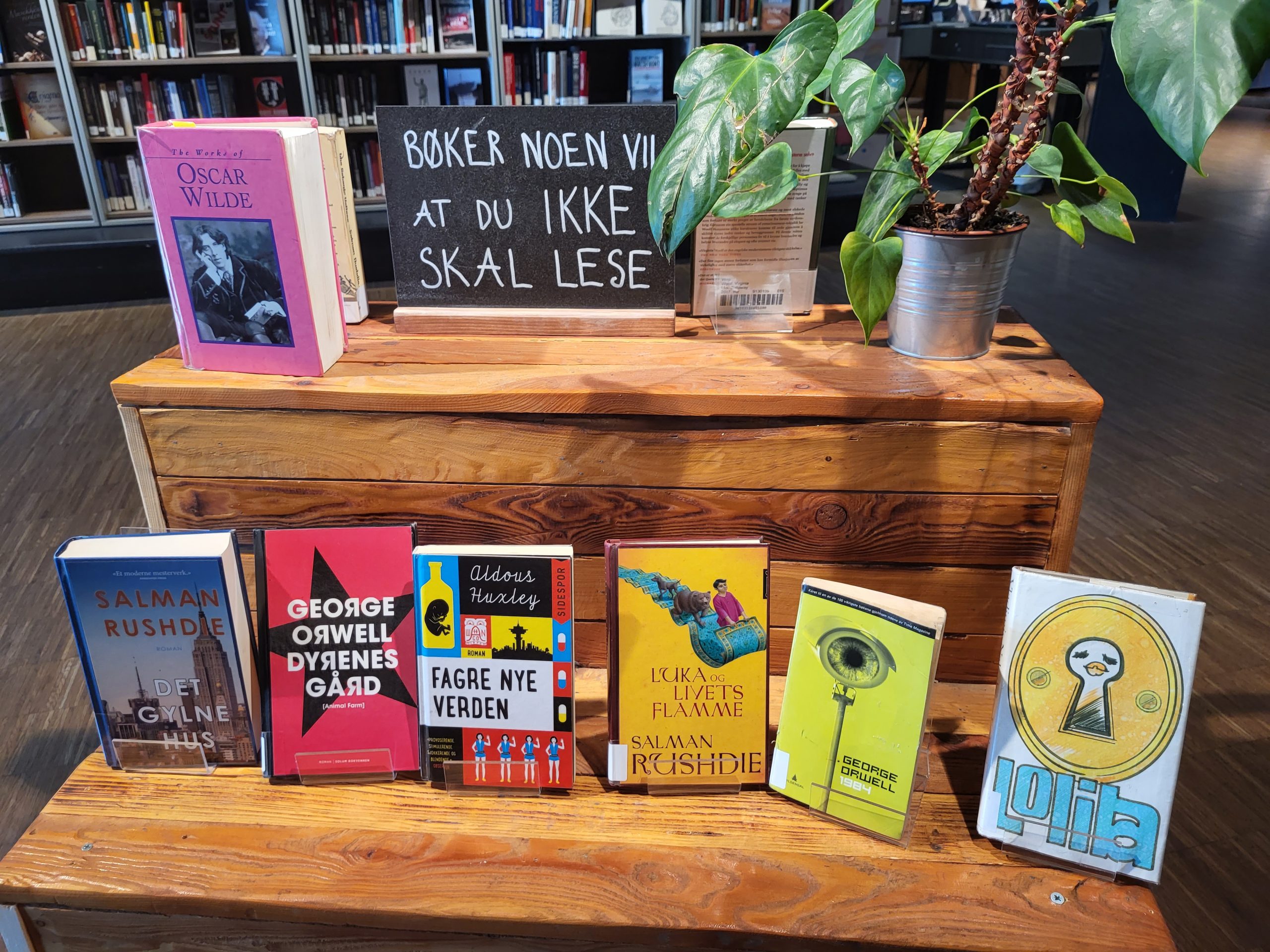 De ansatte hadde laget en utstilling om «bannlyste bøker og forfattere» og «bøker noen vil at du ikke skal lese». En sliten, engelsk utgave av Sataniske vers, med vanskelig leselig skrift, sto utstilt sammen med bøker som Agnar Mykles Sangen om den røde rubin og Oscar Wildes Bildet av Dorian Gray.
