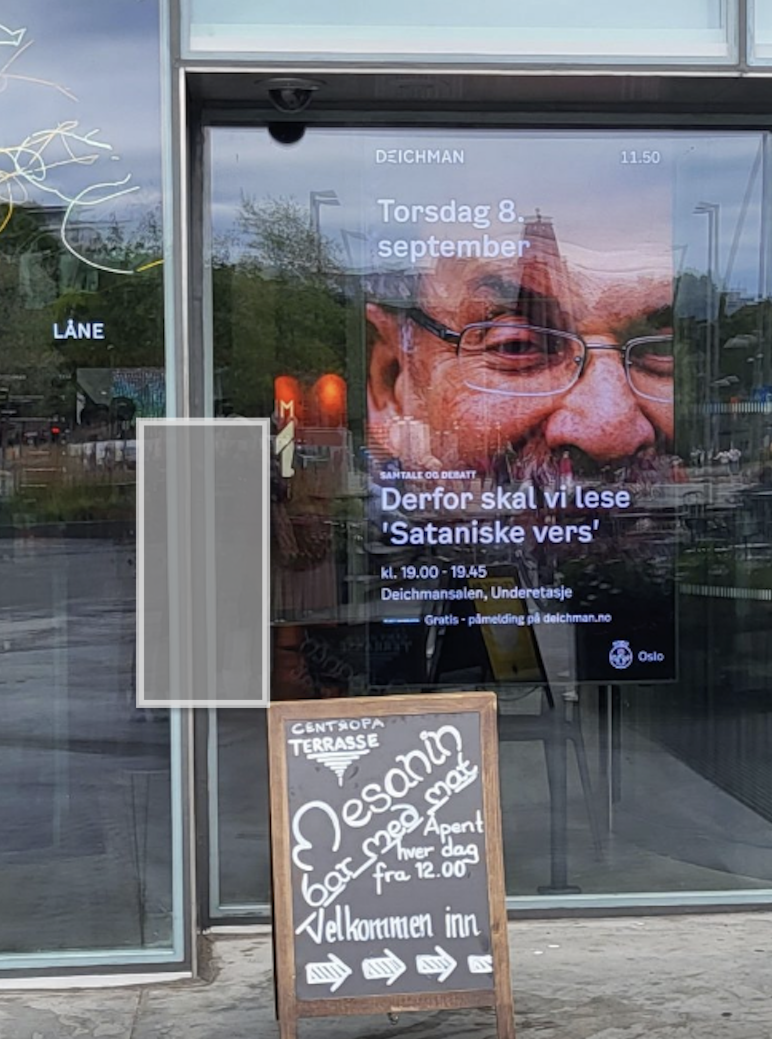 Kort tid etter attentatet mot Rushdie var «Anette» igjen på biblioteket. Hun hadde merket seg plakaten i vinduet til Deichman i Oslo sentrum og tenkte at det var både viktig og riktig at biblioteket satte Rushdie, Sataniske vers og fatwaen mot forfatteren på agendaen, forteller hun HRS. (Grunnet gjenskinn i vinduet er fotoet sladdet.)