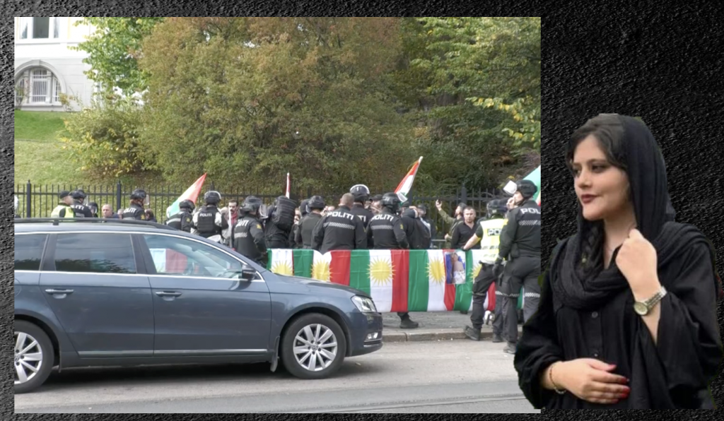 Demonstrasjonen skal ha sin bakgrunn i at Mahsa Amini (22) døde i moralpolitiets varetekt i Iran, fordi hun ikke brukte hijaben korrekt. Det har utløst protester drevet av en mye dypere og emosjonell reaksjon enn tidligere protester mot mullahregimet. Flertallet av demonstrantene skal være kurdere, og de kurdiske flaggene er på plass.