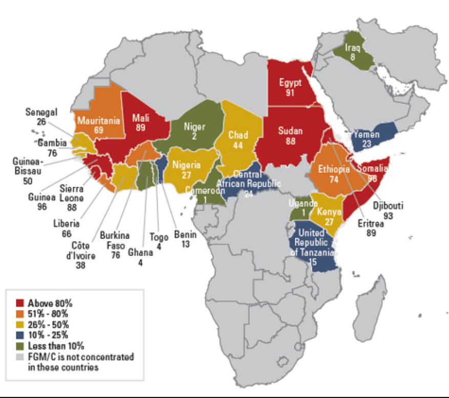 FGM (female genital mutilation, norsk: kjønnslemlestelse, min anm.) praktiseres i 31 land i Afrika, Midtøsten og Asia. Det er mest utbredt i Djibouti, Egypt, Guinea og Mali, hvor 90 % eller mer av kvinner i alderen 15 til 49 har blitt utsatt for kjønnslemlestelse. Med rekordnivåer av migrasjon det siste tiåret, har migranter også tatt med seg den skadelige praksisen til andre land, inkludert Australia, New Zealand, Storbritannia, USA og Japan.