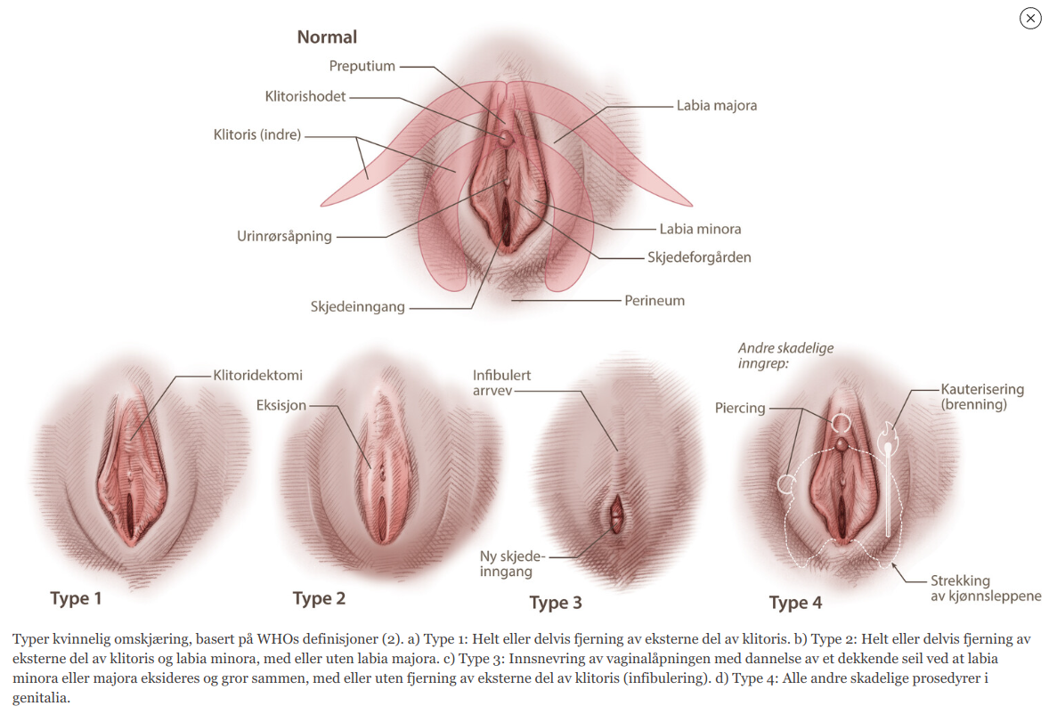 - Type 4: Alle andre skadelige inngrep i kvinners kjønnsorgan av ikke-medisinske årsaker, f.eks. prikking, gjennomhulling, skjæring, skraping eller brenning.