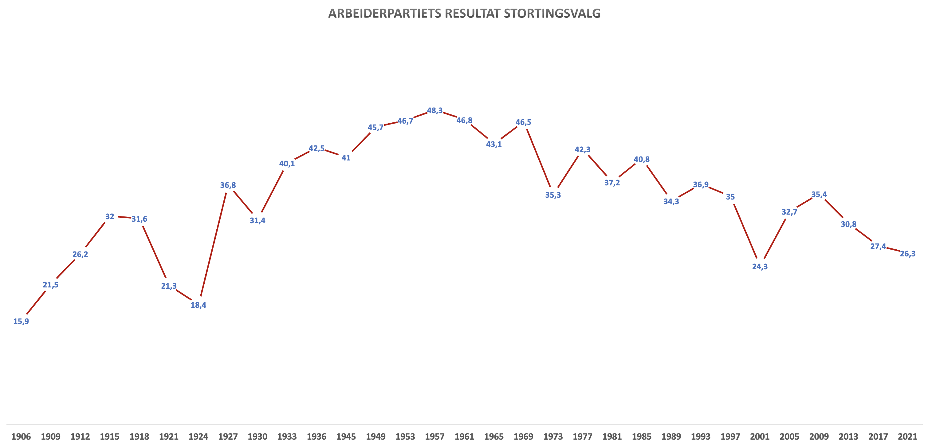Med en oppslutning på 16,9 for Ap skriver de historie. De må tilbake til 1906 (!) for å se lignende tall, da med 15,9 prosent. I nyere tid har Ap hatt sin beste tid i tiårene etter krigen. I 1957 gjordede Ap sitt beste valg noensinne med 48,3 prosent oppslutning. Men også i 1961 og 1969 var kanonår med henholdsvis 46,8 og 46,5 prosent. Etter 1985 har partiet ikke sett 40-tallet, men plasserte seg på 30-tallet (med unntak av Aps krisevalg i 2001) for så i de to siste stortingsvalgene ha ligget på 20-tallet.