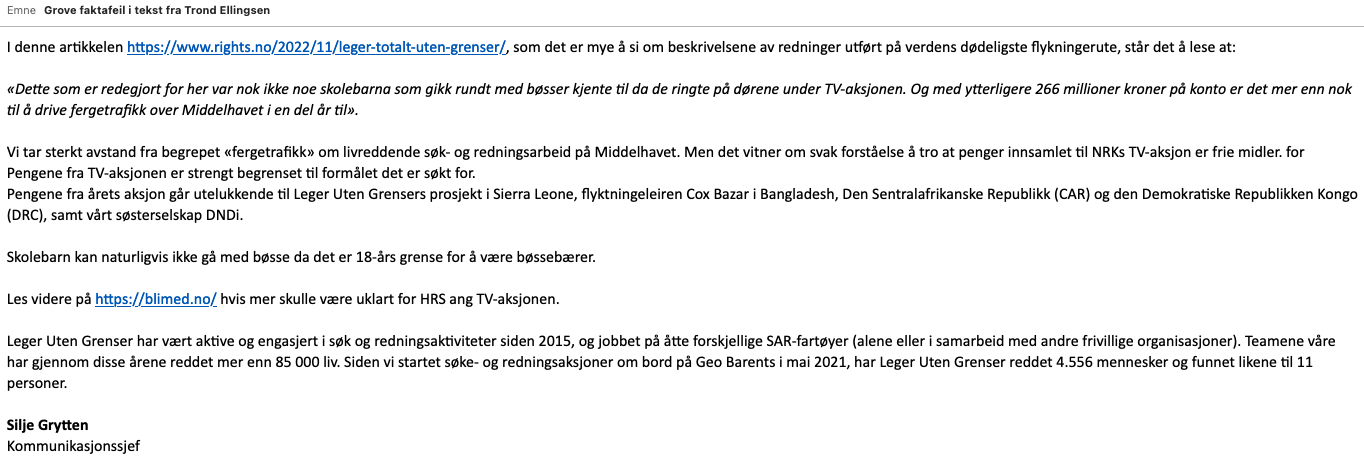 Vår artikkel av 1. november – Leger totalt uten grenser – om organisasjonens fergetrafikk mellom Libya og Italia, har i hvert fall fanget hennes interesse. I en e-post mottatt den 2. november skriver hun at det er «grove faktafeil» i artikkelen, fordi de pengene som ble samlet inn under TV-aksjonen var øremerket til organisasjonens prosjekter i Sierra Leone, flyktningeleiren Cox Bazar i Bangladesh, Den Sentralafrikanske Republikk og den Demokratiske Republikken Kongo, samt søsterselskapet DNDi. Sistnevnte jobber med utvikling av legemidler mot tropiske sykdommer.