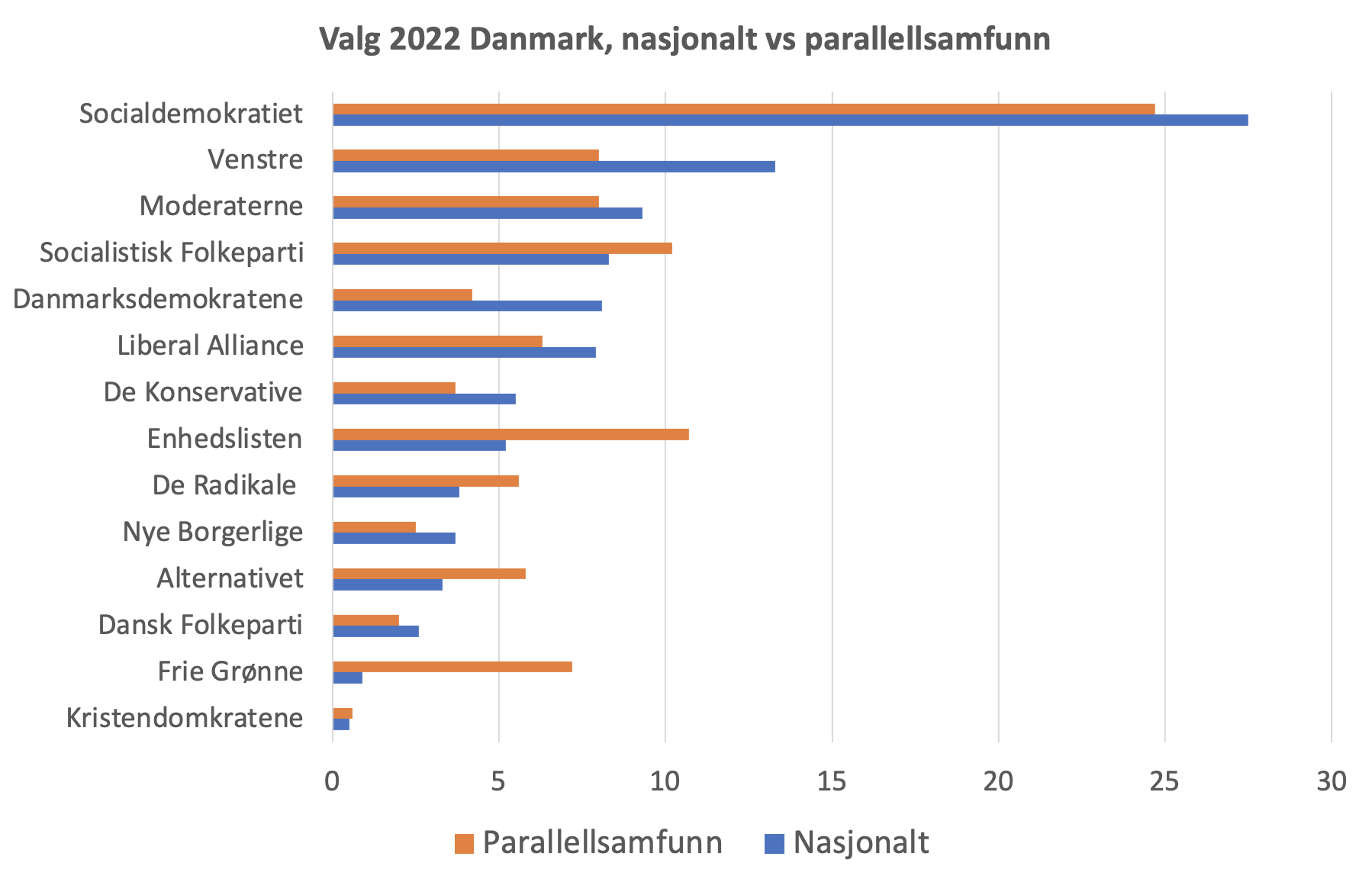 – Mens velgerne samlet sett har fokusert på generelle spørsmål som inflasjon, klima og helse, er det nok heller saker som asylpolitikk, regler for familiegjenforening og ytelser til fattige barnefamilier det stemmes over i mange av parallellsamfunnene, sier han.
