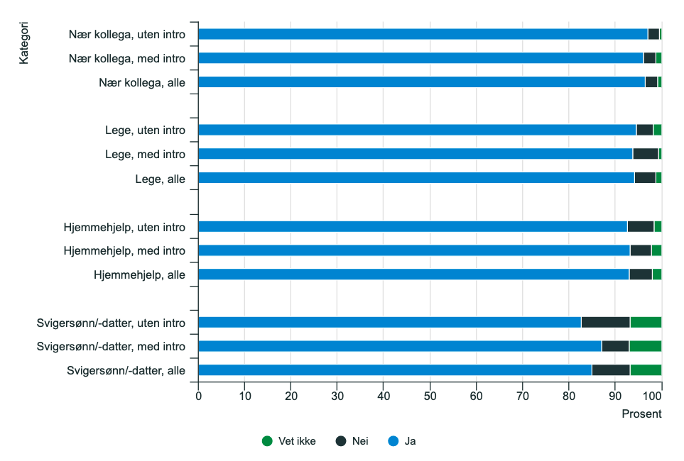 Uansett, også her er respondentene overveldende positive. Langt de fleste, over 9 av 10, er «komfortabel» med en innvandrer både som hjemmehjelp, lege eller nær kollega. Litt mer tilbakeholden er vi med en svigersønn eller -datter som innvandrer, men med 85 prosent som er positive er det et solid resultat.