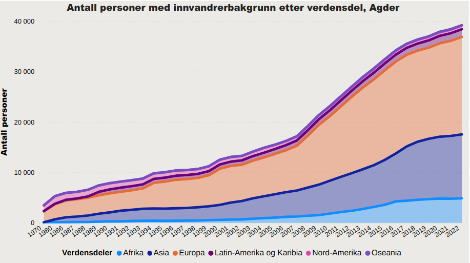 Agder har opplevd stor vekst i antall innbyggere med innvandrerbakgrunn, og påfølgende stor vekst i kriminalitet. På fylkeskommunens nettsider finner vi hvor stor veksten faktisk har vært, og grafen viser at andelen innvandrere med MENA-opprinnelse er om lag 50 prosent av alle innvandrere. Nær 20.000 bosatte i Agder har opprinnelse i Afrika og Asia.