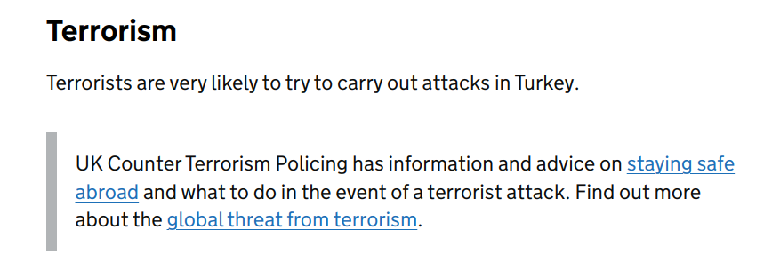 På samme side kan man lese at det er økt trussel om terrorangrep mot kirker, synagoger, ambassader/konsulater og andre steder som besøkes av vestlige i Istanbul. «Det britiske generalkonsulatet i Istanbul er foreløpig ikke åpent for publikum som en forholdsregel», opplyses det.