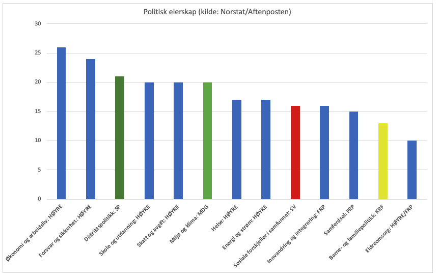 Vinneren er igjen Høyre. De har eierskap til syv politiske områder, herunder ett sammen med FrP, mens Frp kommer på andreplass med eierskap til tre områder. Sp, MDG, SV og KrF har ett hver. Ap glimrer med sitt fravær på listen. Det samme gjør Rødt og Venstre.