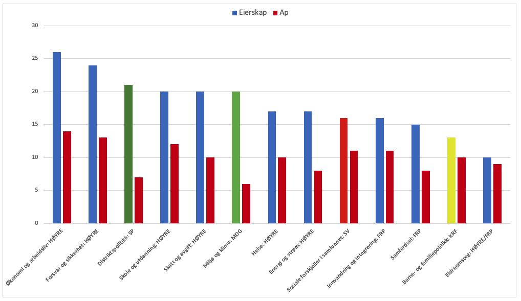 At Aps krise stikker dypt viser også Norstats undersøkelse gjennomført for Aftenposten. Her har velgerne blitt spurt om hvilket parti som har best politikk på 13 politiske områder, der Ap ikke har eierskap til noen lengre. Dette i motsetning til rett etter stortingsvalget i 2021, da hadde Ap eierskap til 7 av 12 områder – og tapet har skjedd i rekordfart.