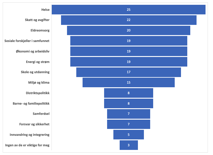 Undersøkelsen har også spurt om hvilke saker velgerne mener er de viktigste for høstens kommunevalg. Merk så at det er kommunevalg, for det er typisk noe forskjell på viktigste saker i kommunevalg og nasjonale valg.